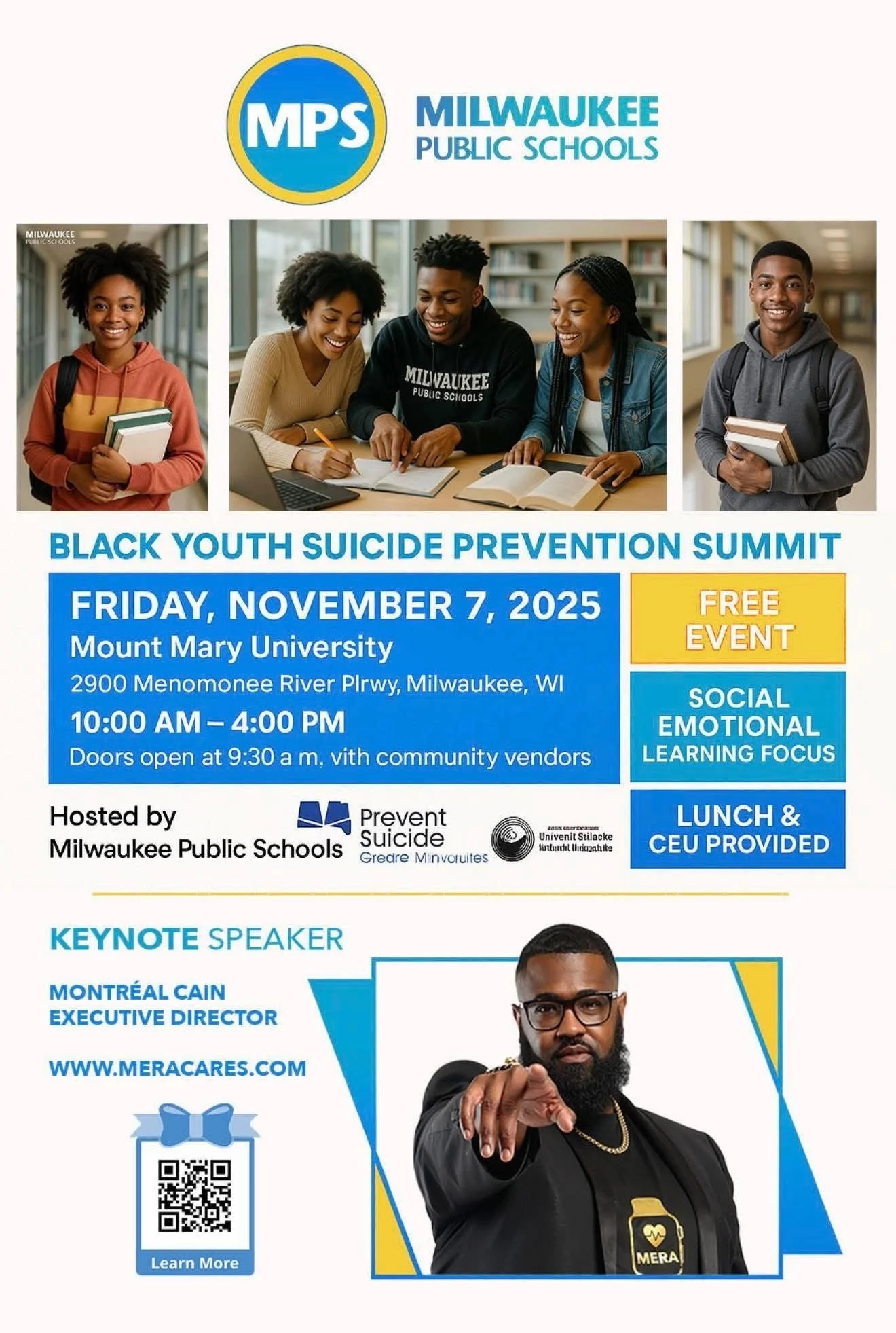 Nov 7 MPS: Black Youth Suicide Prevention Summit Friday, November 7, 2025 10:00 AM 4:00 PM Mount Mary University (map) Google Calendar ICS View Event →